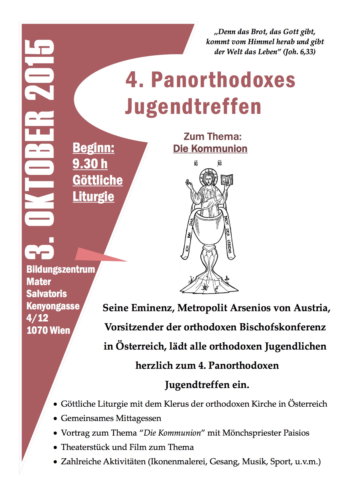 Τό Σάββατο 3 Ὀκτωβρίου 2015 ὁ Σεβ. Μητροπολίτης Αὐστρίας κ. Ἀρσένιος ὡς πρόεδρος τῆς Συνελεύσεως τῶν Ὀρθοδόξων Ἐπισκόπων στήν Αὐστρία καλεῖ ὅλους τούς ὀρθοδόξους νέους στήν 4η Συνάντηση Νεολαίας. Ἡ Ἐκδήλωση πού πραγματοποιεῖται γιά τέταρτη συνεχή χρονιά στήν Αὐστρία, ἔγινε ἀγαπημένο γεγονός γιά τήν ὀρθόδοξη Νεολαία καί ὀρατό σημεῖο τῆς Ἑνότητας τῶν Ὀρθοδόξων στήν Αὐστρία. Ὀρθόδοξοι νέοι ἀπό ὅλη τή χώρα συναντώνται, γιά νά συμμετέχουν μαζί στή θεία Λειτουργία, νά μιλήσουν γιά τήν πίστη τους καί νά γνωρισθοῦν. Μέ τήν βοήθεια καί τόν κόπο τῶν Καθηγητῶν τοῦ Μαθήματος τῶν Ὀρθοδόξων Θρησκευτικῶν, καθώς καί ἐθελοντῶν βοηθῶν προσφέρεται στούς συμμετέχοντες καί φέτος πλούσιο πρόγραμμα.