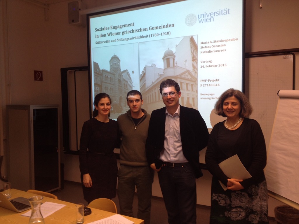 Ἐκ μέρους τοῦ Ἰνστιτούτου Βυζαντινῶν καί Νεοελληνικῶν Σπουδῶν προσκάλεσε τήν Τρίτη 25 Φεβρουαρίου ἡ Καθηγήτρια κ. Μαρία Στασινοπούλου τοῦ Πανεπιστημίου τῆς Βιέννης σέ μία Ἑσπερίδα μέ θέμα: «Ἡ κοινωνική δράση τῶν Ἑλληνικῶν Κοινοτήτων Βιέννης: Χορηγοί καί μεγάλες δωρεές (1780-1918), πού πραγματοποιήθηκε ἀπό τήν Αὐστριακή Ἑταιρεία Νεοελληνικῶν Σπουδῶν. Παρουσιάσθηκαν τά πρῶτα εὑρήματα τοῦ τριετοῦς ἐρευνητικού προγράμματος μέ θέμα «Κοινωνική Δράση τῶν Ἑλληνικῶν Κοινοτήτων Βιέννης (18ος-20ος αἰ.)», πού ἀπό τόν Νοέμβριο τοῦ 2004 τελεῖ ὑπό τή διεύθυνση τῆς Καθηγήτριας κ. Στασινοπούλου στό Πανεπιστημιο τῆς Βιέννης καί βασίζεται σέ σημαντικό βαθμό στό ἀρχειακό ὑλικό τῶν Ἑλληνικῶν Ἐκκλησιαστικῶν Κοινοτήτων τοῦ Ἁγίου Γεωργίου καί τῆς Ἁγίας Τριᾶδος.