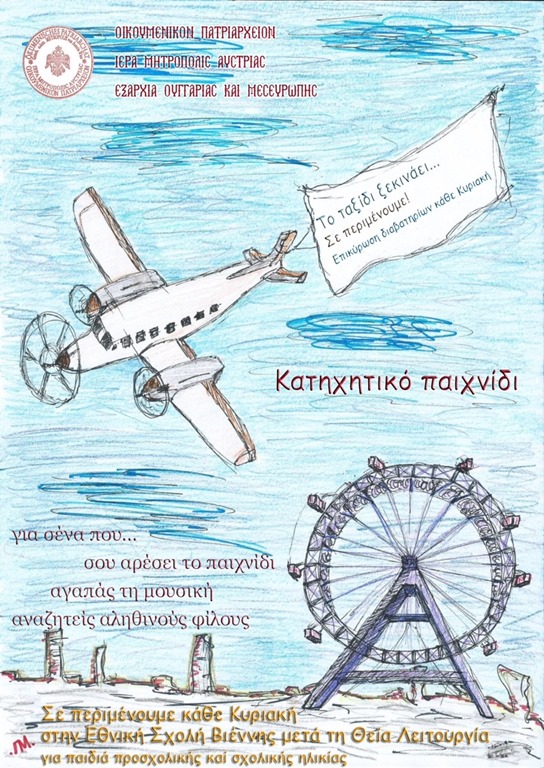 Τήν Κυριακή 10 Νοεμβρίου θά ξεκινήσει τό Κατηχητικό σχολεῖο στήν Ἐθνική Σχολή Βιέννης. Μέ τραγούδια, ποιήματα καί παιχνίδια μία ὁμάδα νέων μέ τή βοήθεια τῶν θεολόγων θά βοηθήσουν τά παιδιά νά γνωρίσουν τήν ἐν Χριστῷ ζωή καί νά ἔρθουν πιό κοντά στήν Ἐκκλησία. Τό κατηχητικό θά λαμβάνει χώρα κάθε Κυριακή μετά τή θεία Λειτουργία. Ὁ Σεβασμιώτατος καί οἱ κατηχητές σᾶς καλοῦν ἐγκάρδια. Ἐλπίζουμε ὅτι πολλές οἰκογένειες θά ἐκμεταλλευτοῦν τήν προσφορά καί θά ἀνταποκριθοῦν στό κάλεσμα τῆς Ἐκκλησίας.